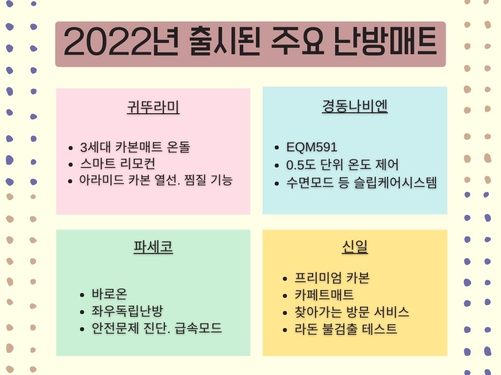 겨울 대비 하셨나요? 올해 출시된 주요 난방매트 특징을 비교해 보았습니다. 최근에는 '3세대 난방매트'로 불리는 카본매트가 등장했죠.
